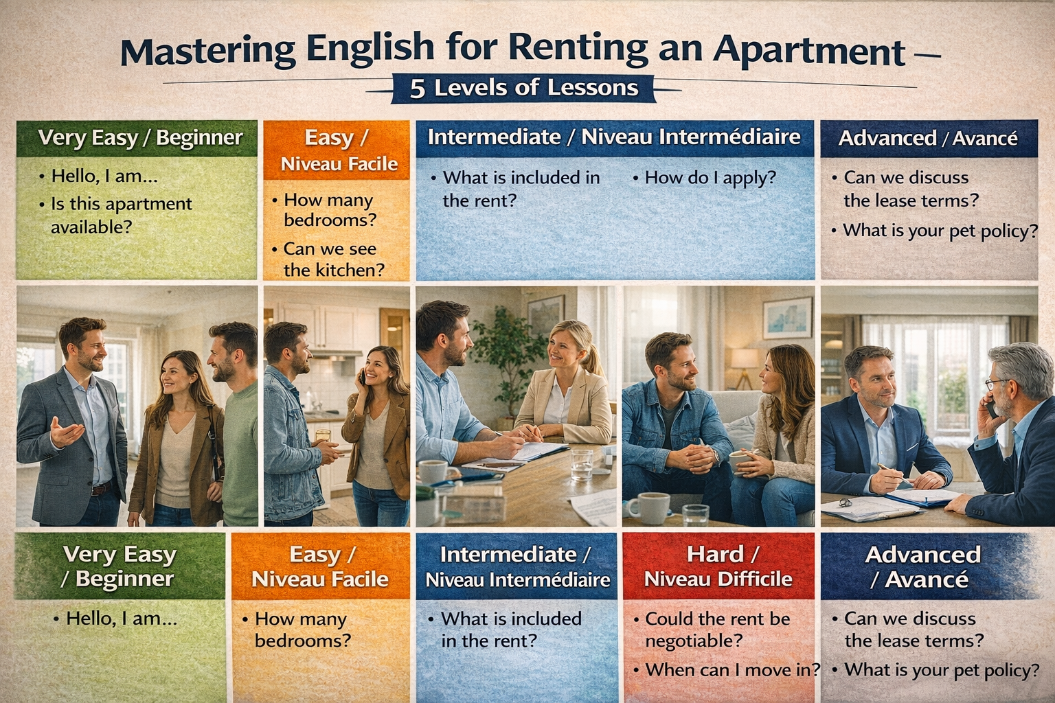 Pourquoi : Phrase simple, directe, vocabulaire clé pour la location.